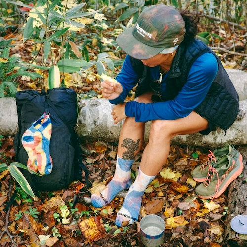 贅沢に染め上げた心の自由が得られるソックス。ひとつとして同じ柄は存在しない、トレイルを楽しくさせるタフで履き心地の良いソックスです。